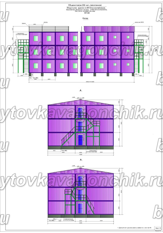 ГлавнаяПроекты готовых решенийМодульные здания → Фасады трехэтажного общежития на 250 человек из 84 шт БК